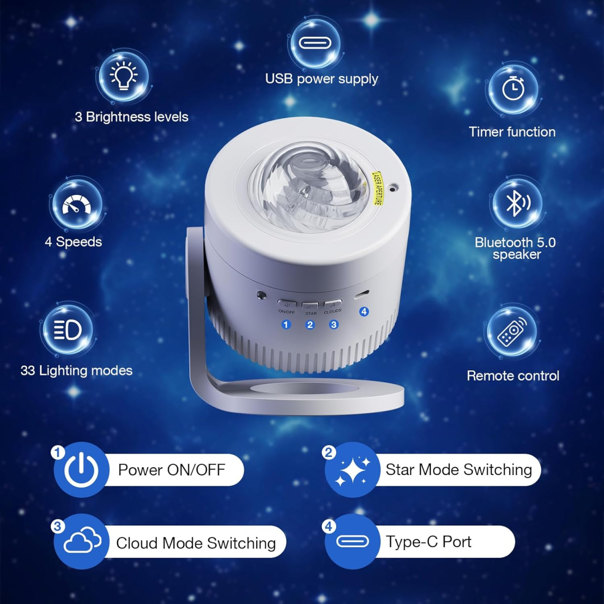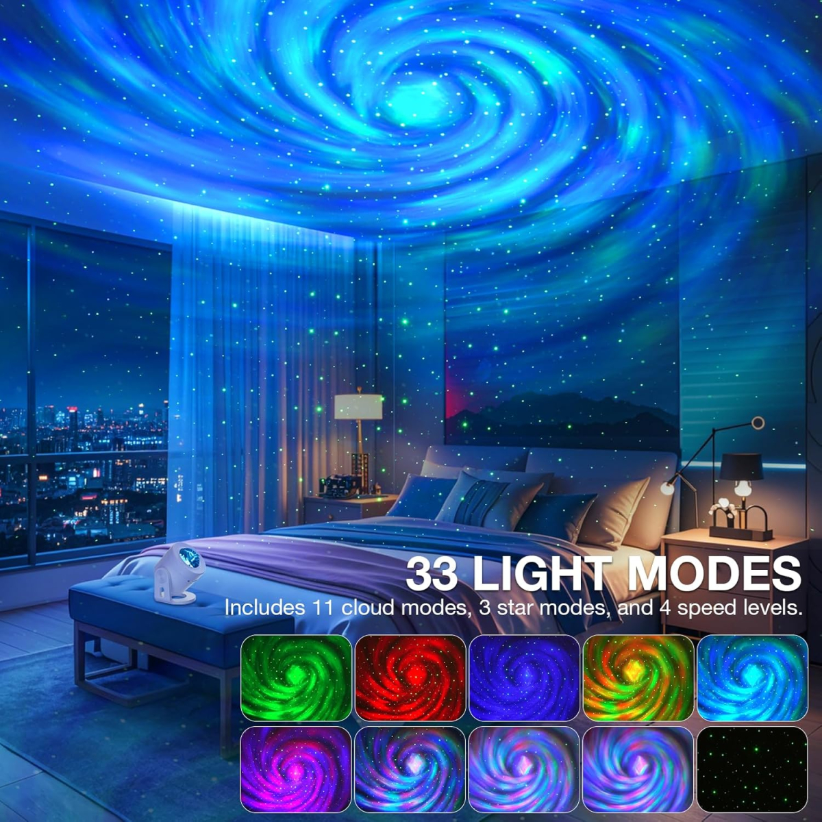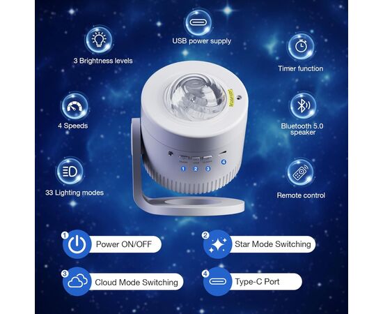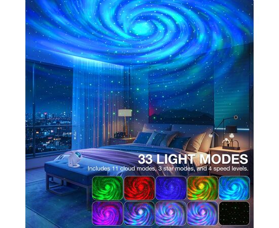 - 33 динамічні ефекти проєкції зірок та 4 регульовані швидкості потоку північного сяйва для різноманітних візуальних ефектів.